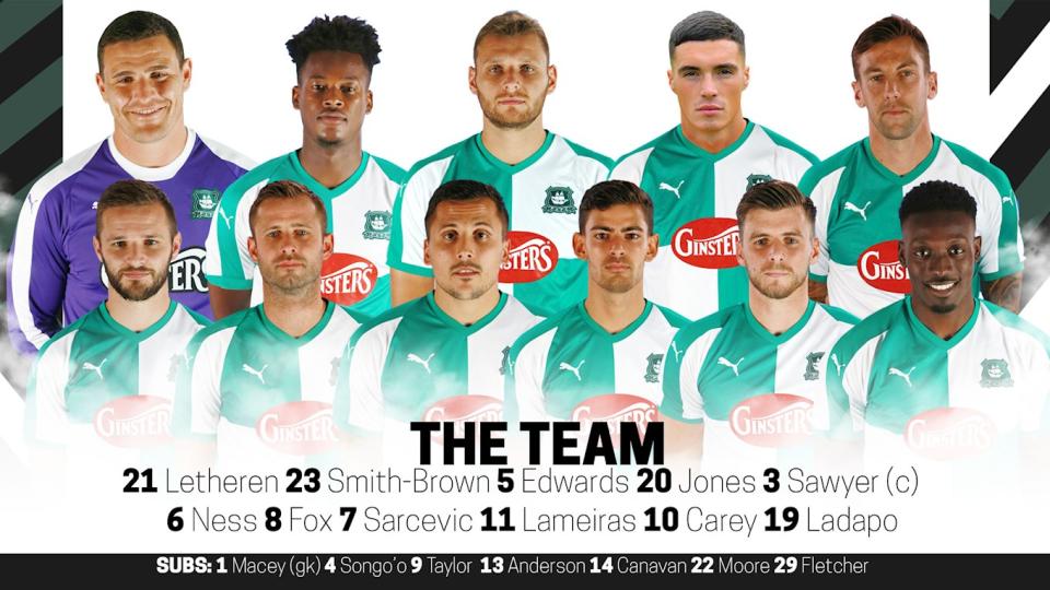 Argyle: 21 Kyle Letheren; 3 Gary Sawyer (capt), 5 Ryan Edwards, 6 Jamies Ness, 7 Antoni Sarcevic, 8 David Fox, 10 Graham Carey, 11 Ruben Lameiras, 19 Freddie Ladapo, 20 Lloyd Jones, 23 Ashley Smith-Brown. Substitutes: 1 Matt Macey (gk), 4 Yann Songo'o, 9 Ryan Taylor, 13 Paul Anderson, 14 Niall Canavan, 22 Tafari Moore, 29 Alex Fletcher.