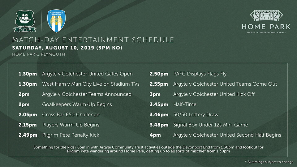 SATURDAY’S game against Colchester United will see our opening Sky Bet League Two fixture at Home Park in the 2019-20 campaign.