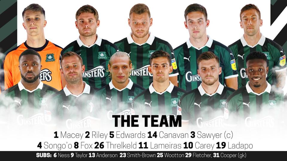 Argyle: 1 Matt Macey; 3 Gary Sawyer (capt), 4 Yann Songo’o, 5 Ryan Edwards, 8 David Fox, 10 Graham Carey, 11 Ruben Lameiras, 14 Niall Canavan, 19 Freddie Ladapo, 23 Ashley Smith-Brown, 26 Oscar Threlkeld. Substitutes: 2 Joe Riley, 9 Ryan Taylor, 13 Paul Anderson, 22 Tafari Moore, 25 Scott Wootton, 27 Alex Fletcher, 31 Michael Cooper (gk).