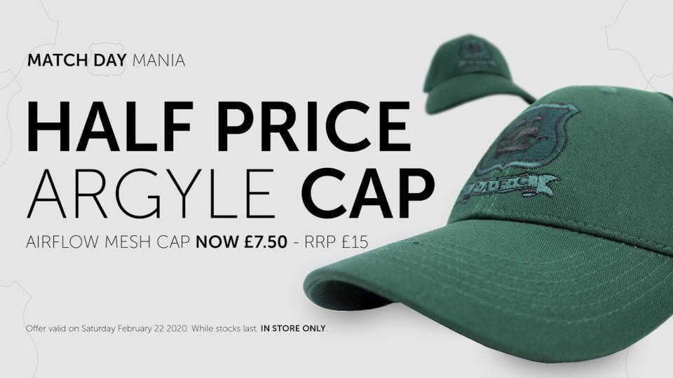 MATCH-DAY Mania for the weekend clash with Crewe Alexandra in Sky Bet League Two will be a half-price Argyle Cap.